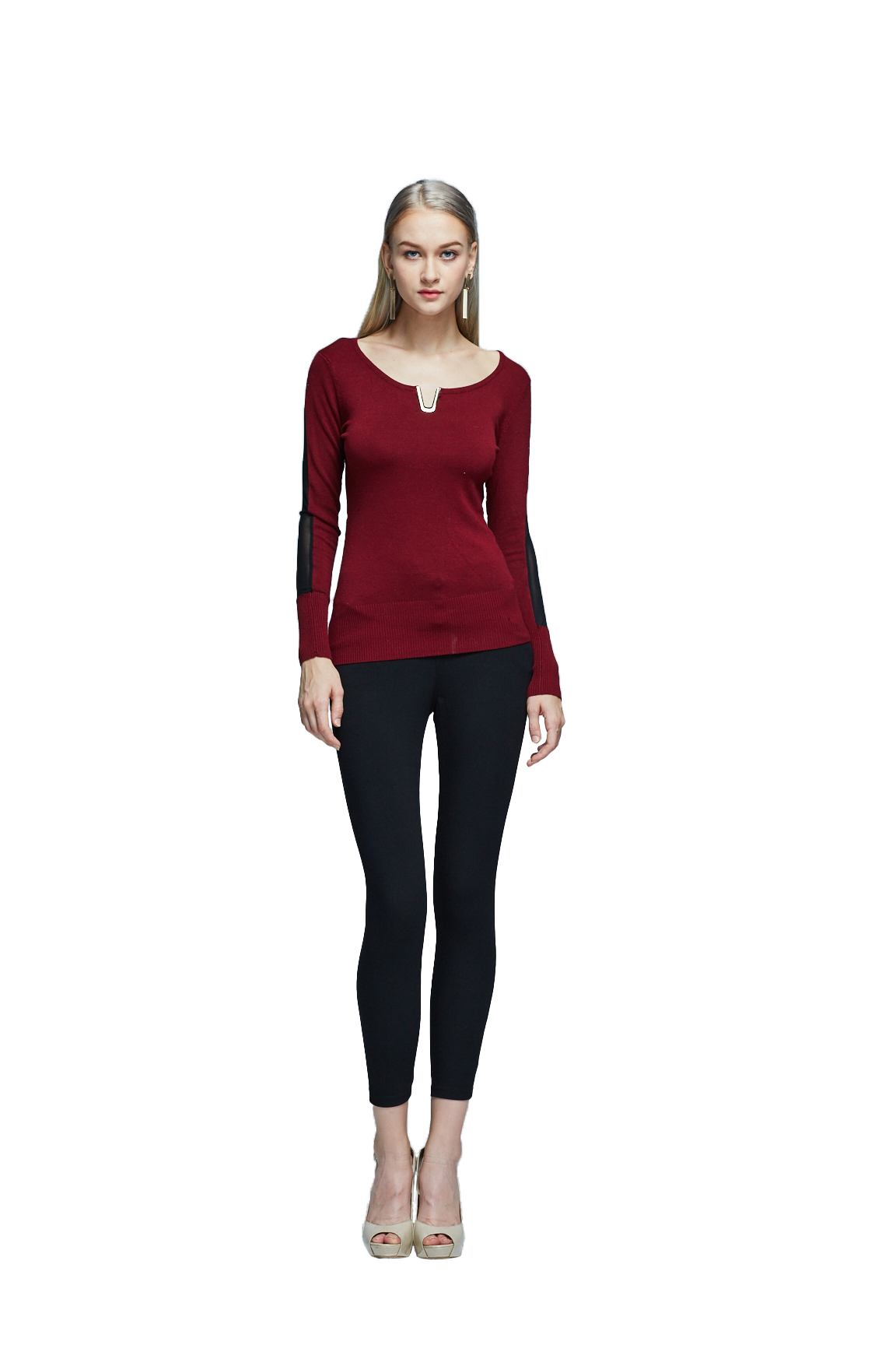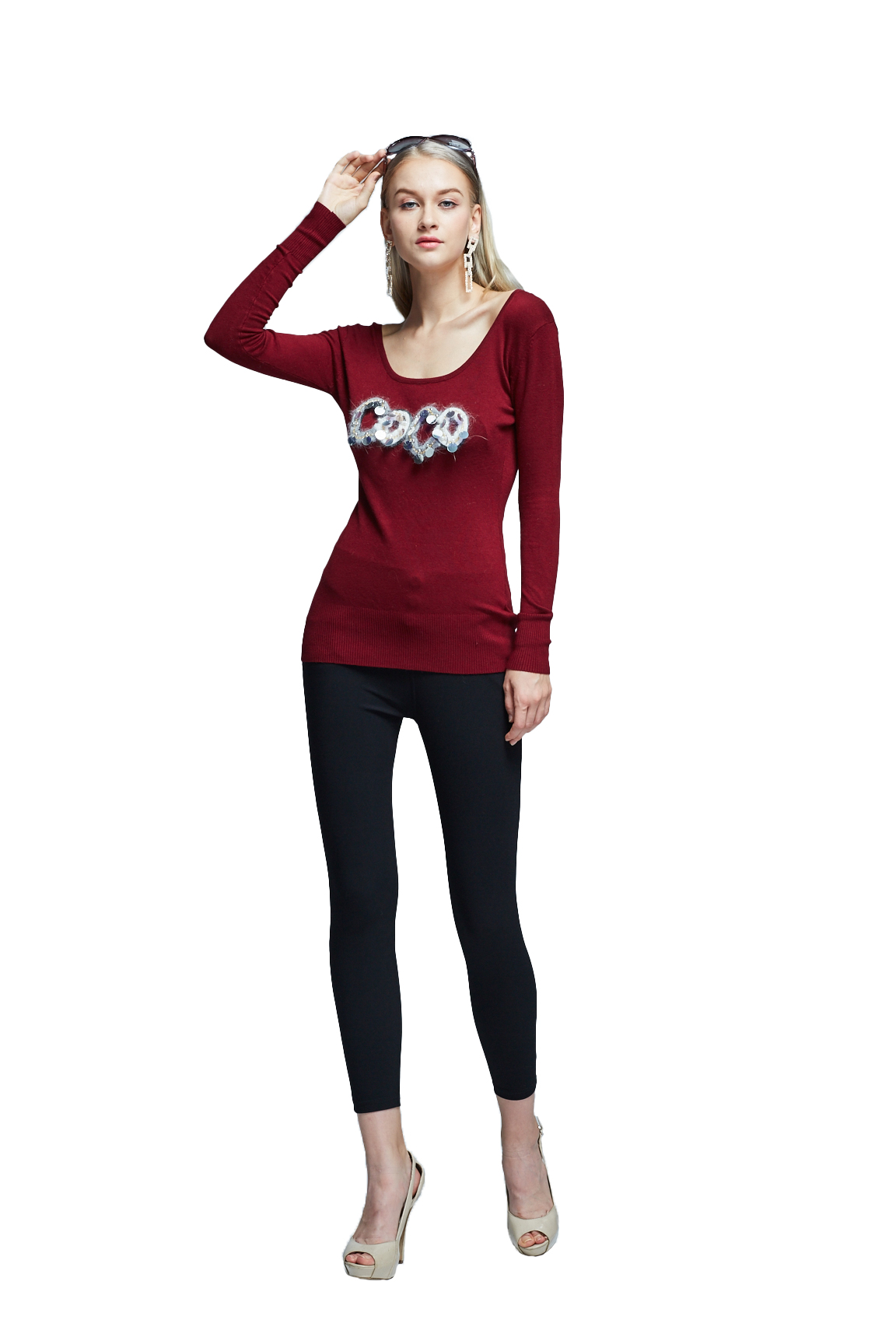 女士深U型前后凤凰刺绣黑红拼接休闲毛衣
