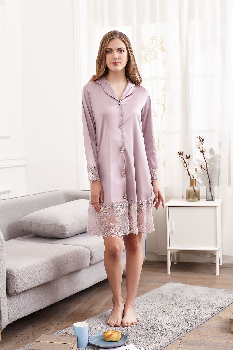 女士新款欧美风冰丝拼接蕾丝诱惑长袖中长款居家睡袍(藕灰)