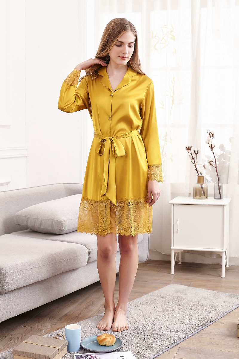 女士新款欧美风冰丝拼接蕾丝诱惑长袖中长款居家睡袍(姜黄)